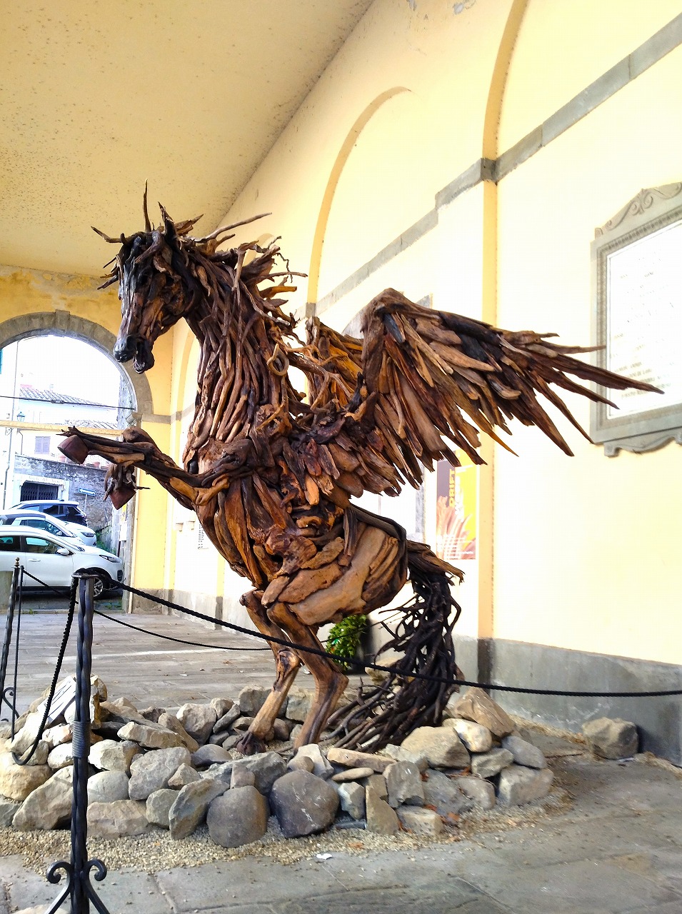 また今回はこぼれ話として、小生が10月末にイタリア中部のトスカーナ地方を旅した時*のトピックスを紹介しました。古都フィレンツェから南東に30km、高速を使って車で50分位の所に、ローロ・チュッフェンナ(Loro Ciuffenna)という渓谷沿いの小さな町があります。栗が有名と聞き栗ジャムとケーキ用の栗粉を求めて足を延ばしたところ、何と町中でペガサスを発見! Andre Ironという彫刻家が流木を使い、自由と力強さを象徴する町のシンボルとして昨年3月に完成したばかりだそう。こんな山の中でペガサスに出会えるなんて。是非とも皆さんにもお知らせしなければとカシャッ。