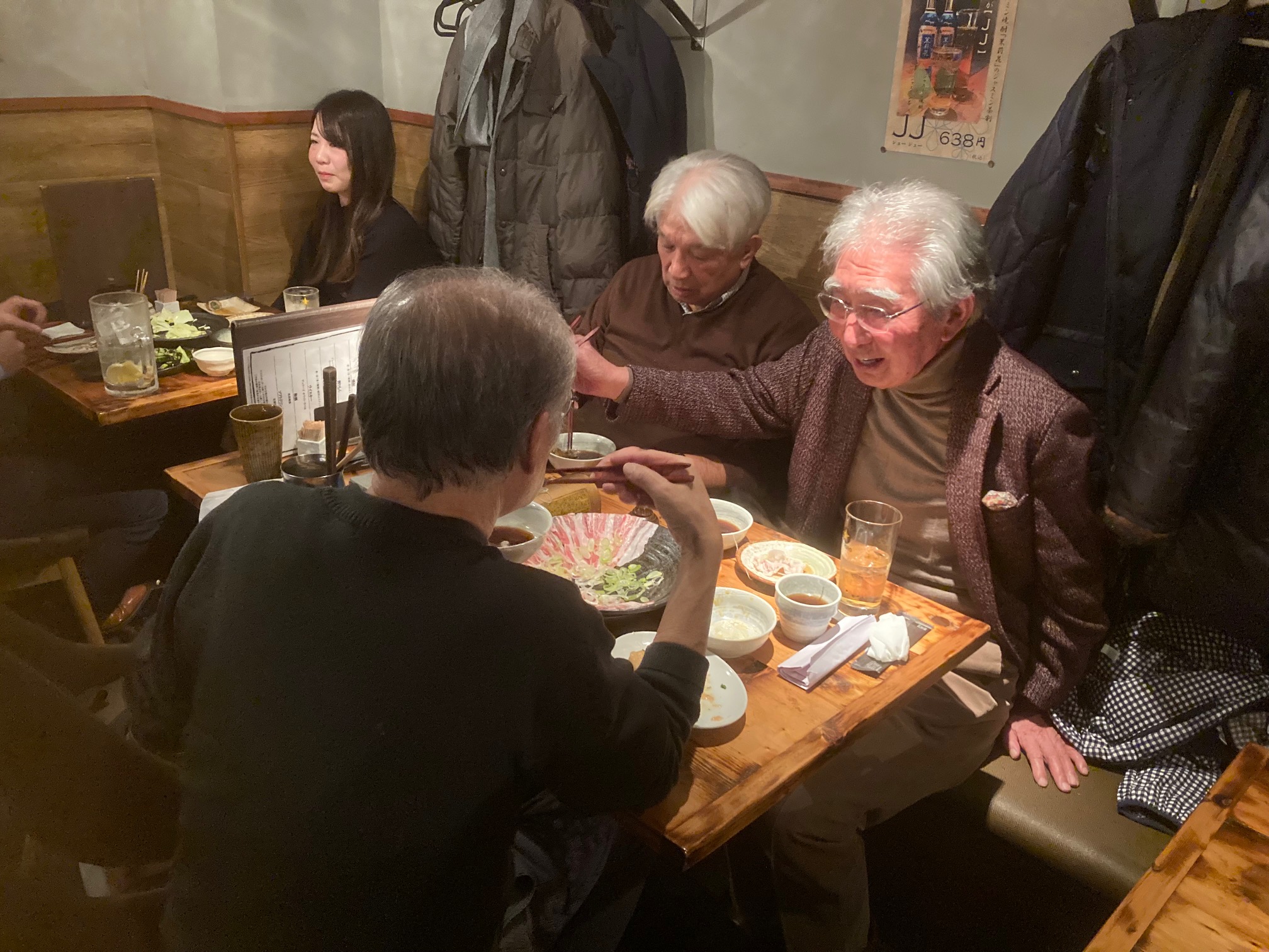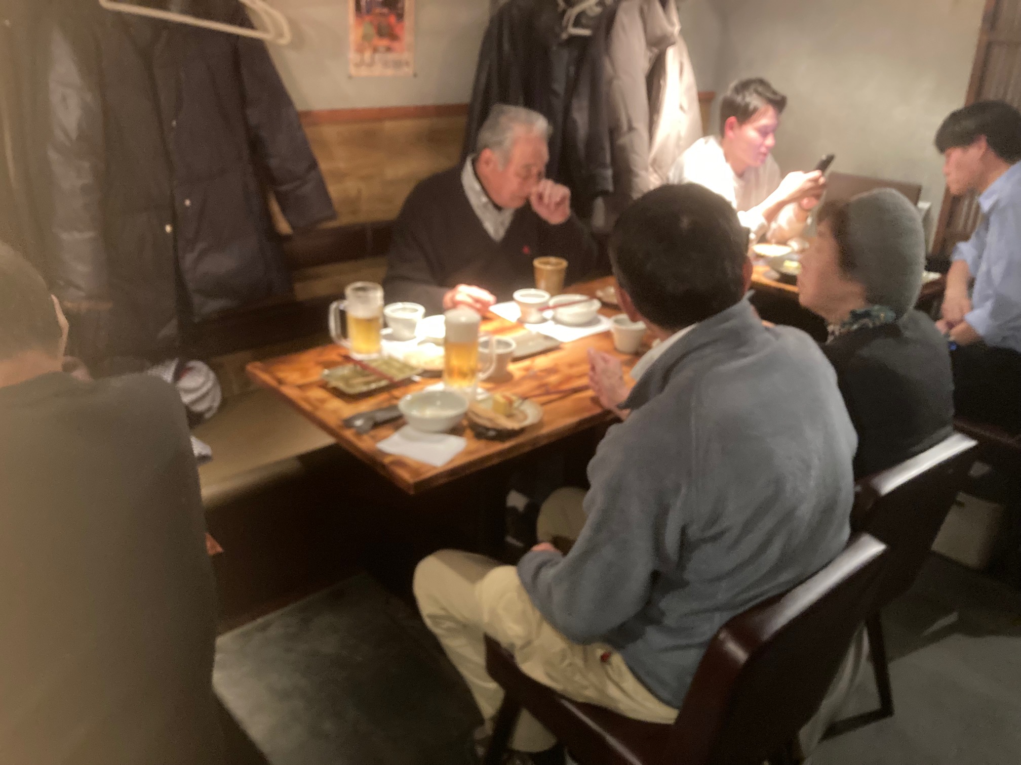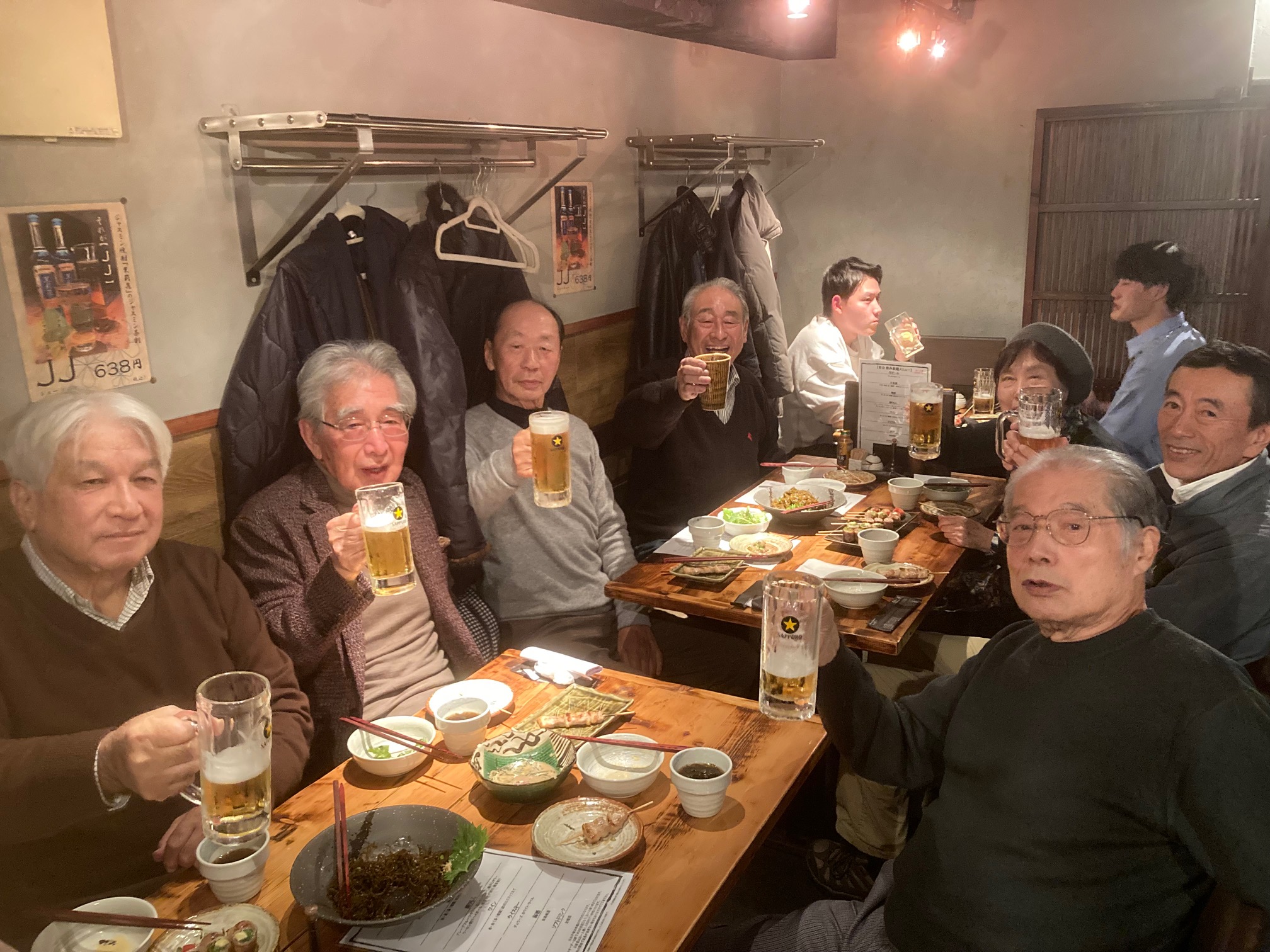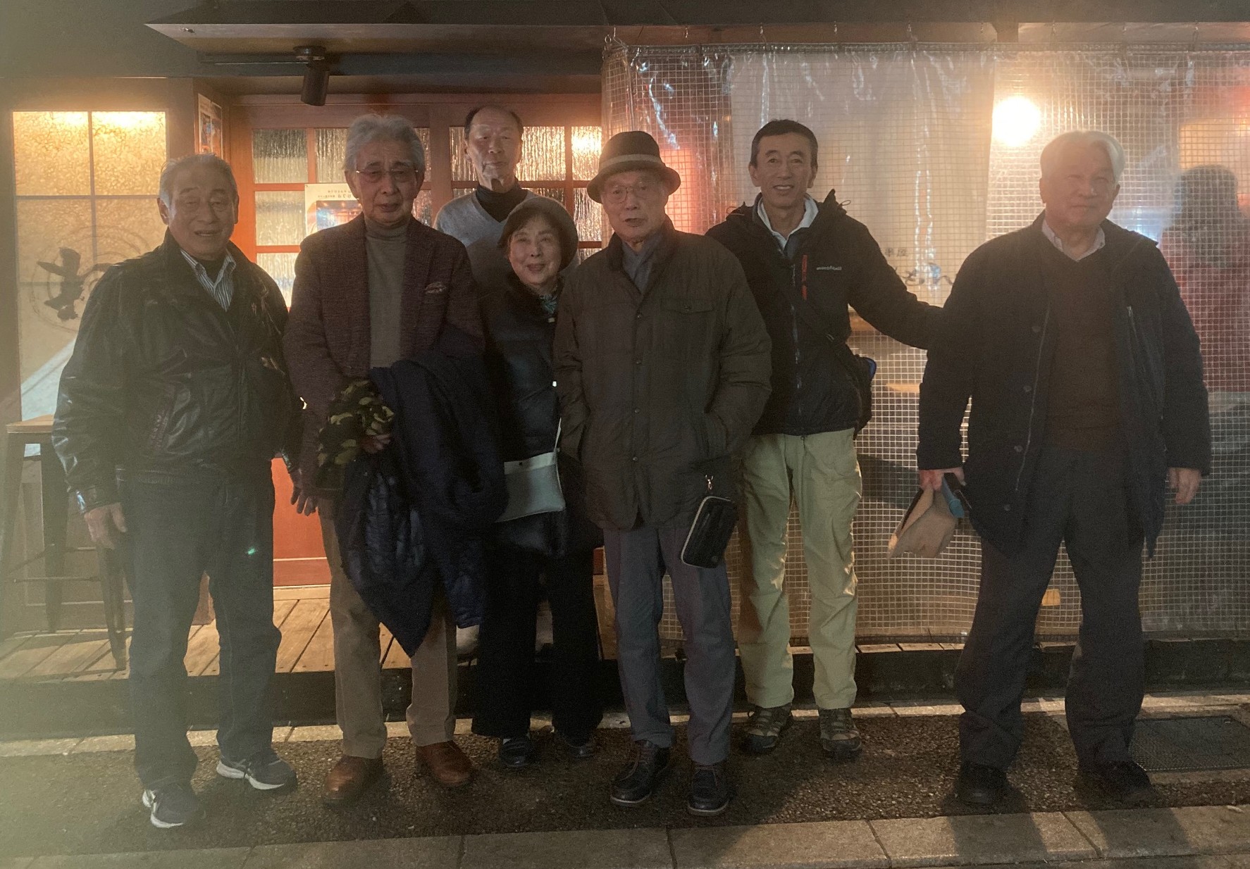 皆さん、いつもの様に飲み物も次々とオーダー、生ビール・ワイン・日本酒・酎ハイ等を存分に飲まれ、且つ、会話も弾み、いつの間にか、2時間が経過、最後に、店舗内で1枚、店舗前で1枚の集合写真を撮り、「良い年をお迎え下さい」との挨拶交換の後、三々五々の散会となりました。 |